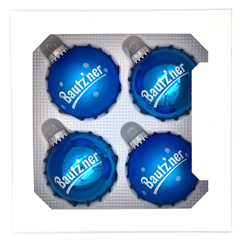 Bautz'ner Weihnachtskugel Set bestehend aus vier blauen Kugeln, zwei Kugeln sind matt und zwei glänzend. Die Kugeln haben einen Durchmesser von 7 cm. Sie sind alle auf einer Seite mit und auf einer Seite ohne Schneeflocken bedruckt.