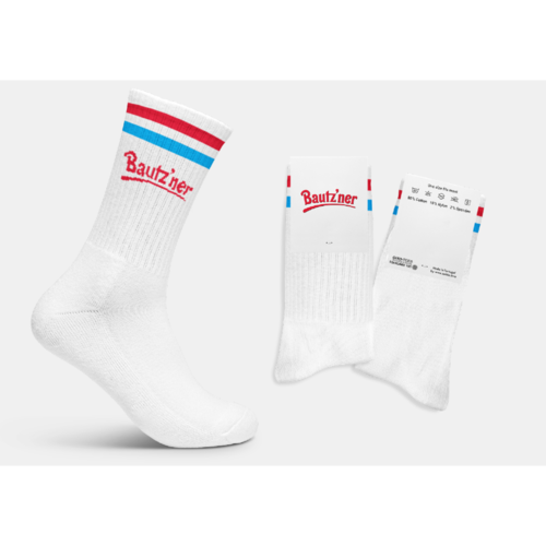 Weiße Sportsocken mit dem Bautz’ner Logo. Die Socken haben eine verstärkte, saugfähige Sohle und einen gerippten Schaft für optimalen Halt. Größe: One Size. Durch Flexibilität gute Passform für kleine, mittlere und große Füße.